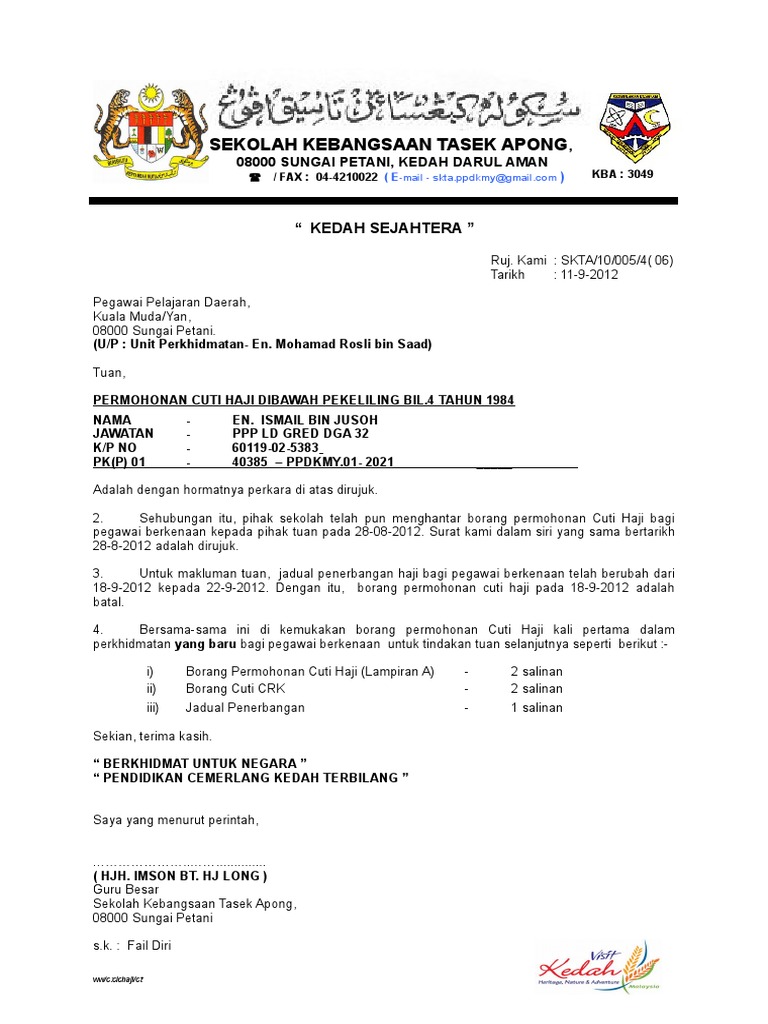 Borang Permohonan Lain Lain Cuti Sakit 2 2bc6 03a Permohonan Cuti Sakit Biasa Jawatan Jabatan Sekolah Pdf Document from reader020.staticloud.net Borang permohonan cuti haji perintah am bab c perkara 34 dan 35 (maksimum 40 hari) bahagian 6. Salinan asal borang yang telah diluluskan hendaklah dihantar ke seksyen hal ehwal perkhidmatan dalam masa 24 jam selepas diluluskan. Jika diluluskan, dan disahkan, anda akan terima bayaran balik wang tak dituntut ini terus ke akaun bank anda seperti dinyatakan dalam tempoh 30 hari. Saya memohon kebenaran cuti rehat selama. Permohonan rayuan haji 2021/ 1442h aplikasi thijari, bakal haji tidak perlu lagi menulis surat atau hadir ke pejabat th untuk merayu. Berkaitan itu, saya memohon menggunakan kemudahan cuti tanpa rekod bagi urusan kematian ahli keluarga terdekat selama _ hari, pada / mulai. Bakal haji kini boleh membuat permohonan rayuan haji bagi musim haji 1442h tahun semasa faq rayuan haji (soalan lazim). Bagi pelajar yang mendapat tawaran di peringkat ijazah sarjana muda akan mendapat rm2000 manakala bagi pelajar di peringkat diploma akan mendapat rm 1500.