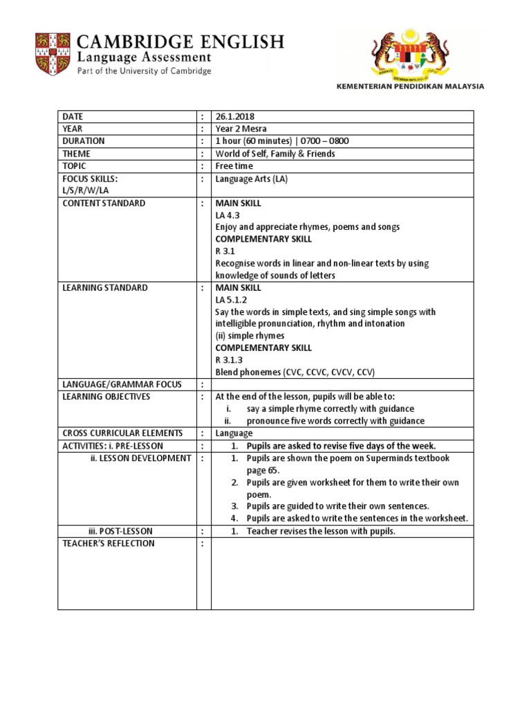 Cefr English Form 4 from imgv2-1-f.scribdassets.com I am sharing my lesson plan. Look at the following lesson objectives/activities. If you're relatively new in the education field or are thinking about entering it then you probably have a vague idea about lesson plan. Of course it is already embedded with drop down menu which i found the most convenient way to quicken our lesson plan writing. But sometimes in the high pressure world of education it can be difficult to find the time to create inspiring lesson plans on your own. See more of english lesson plans and teaching materials on facebook. Before you plan your lesson, you will first need to identify the learning objectives for the lesson. Before you start learning, you choose how long you want to learn malaysian today.